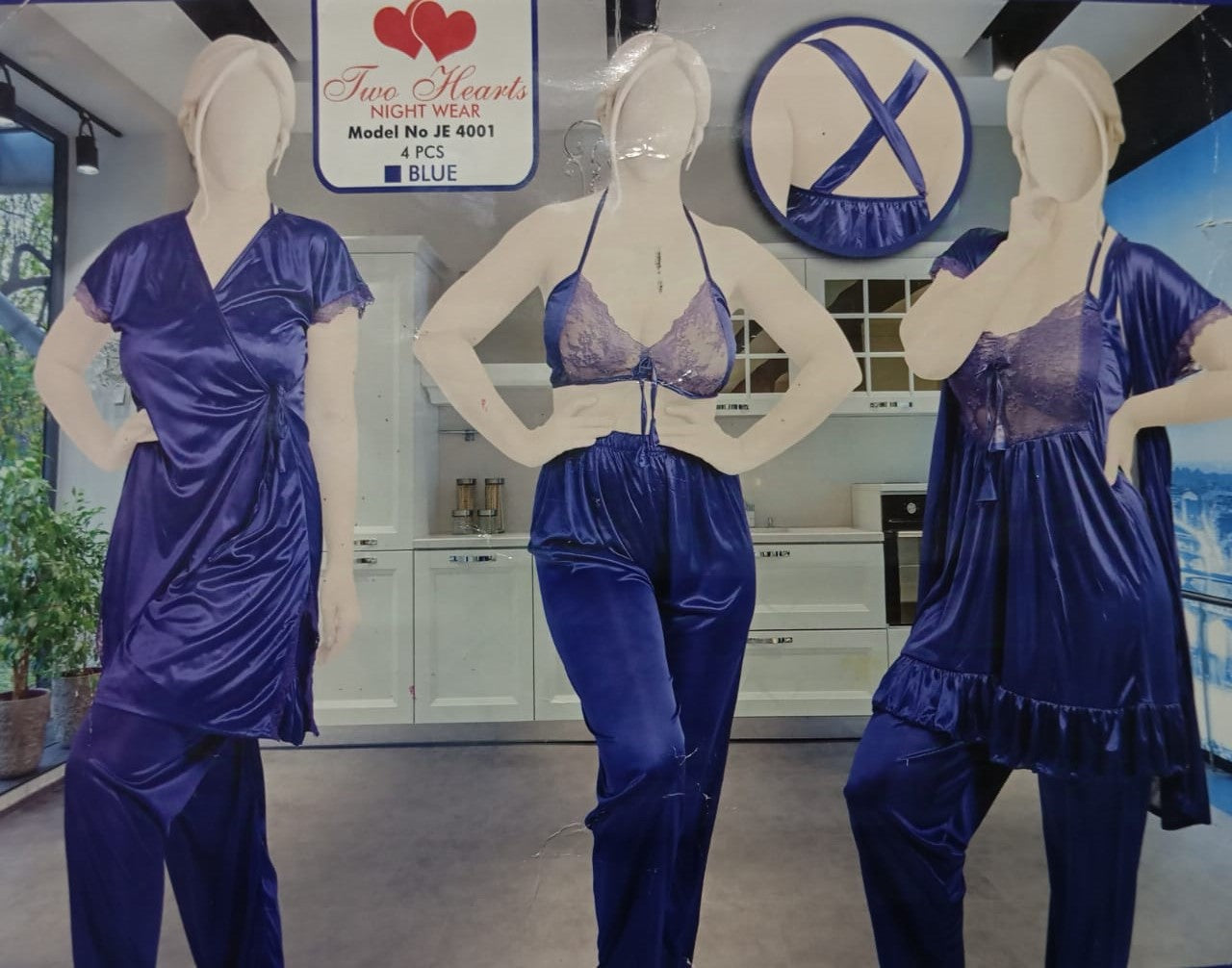 Upgrade your nightwear collection with this 4-Piece Premium Nighty Set, crafted from luxurious satin & net fabric. Designed for style, elegance, and comfort, this set is perfect for everyday wear, bridal wear, or as a gift.